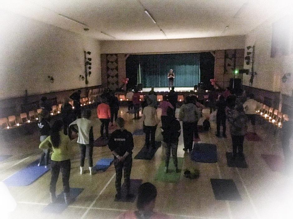 Sata tuikkua toivat valoa Nuorisoseuran saliin, jossa keskityttiin pilates-liikkeisiin valtakunnallisen Nenäpäivän kunniaksi.