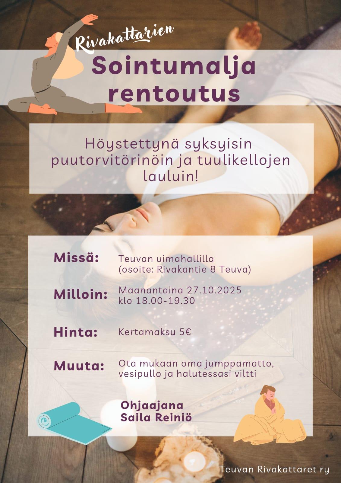 Pidämme kauden päättäjäiseksi venyttely- ja rentoutushetken äänimaljojen säestämänä Teuvan uimahallin tiloissa 9.12.2024 klo 18.30-20.00. Tunnin vetää Saila Reiniö.